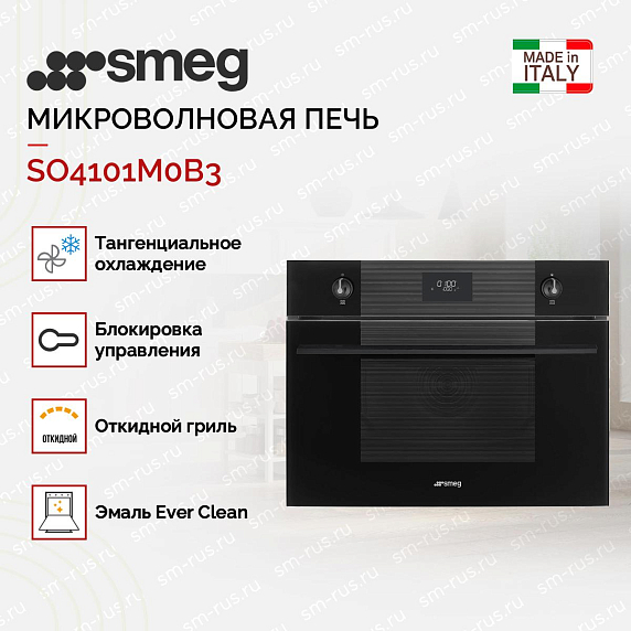 Микроволновая печь Smeg SO4101M0B3 обладает классом энергопотребления A, что говорит о его энергоэффективности. Мощность прибора составляет 3 кВт, мощность гриля — 1.5 кВт, а мощность микроволн — 0.8 кВт. Напряжение прибора составляет 220-240 В, что позволяет подключить его к стандартной электрической сети.