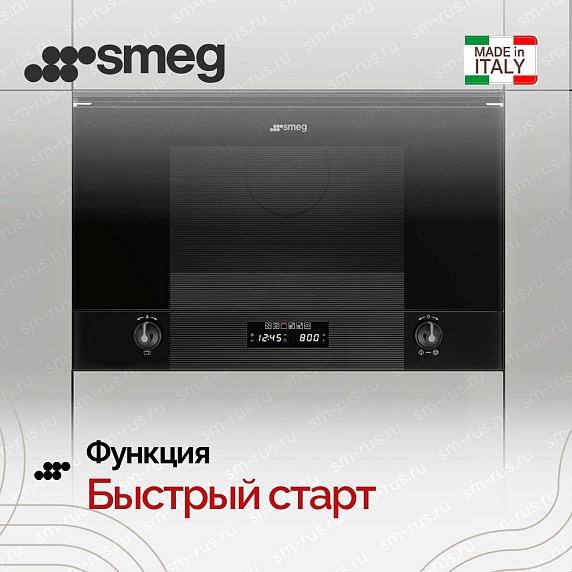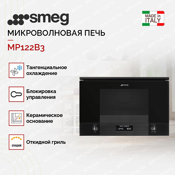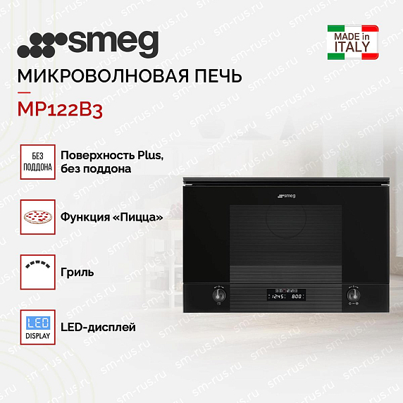 Встраиваемая микроволновка Smeg MP122B3 из серии Linea идет в черном стекле. Модель компактная, высотой всего 38 см, отлично встает в верхний шкаф или колонну. Дизайн минималистичный, без лишних деталей. Камера внутри на 22 литра, сделана из нержавейки, а дно керамическое. Здесь нет привычного поворотного стола, поэтому полезного места больше и можно ставить прямоугольные блюда.