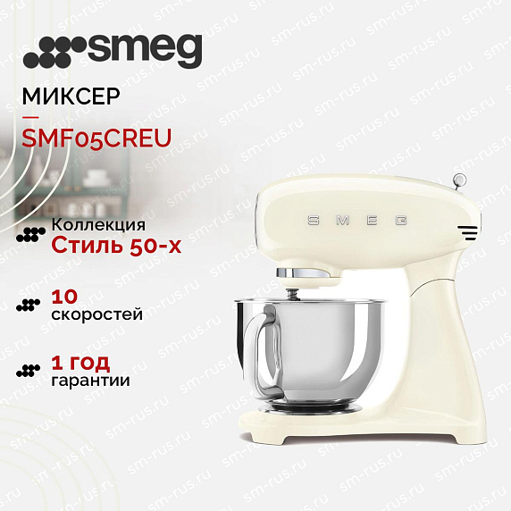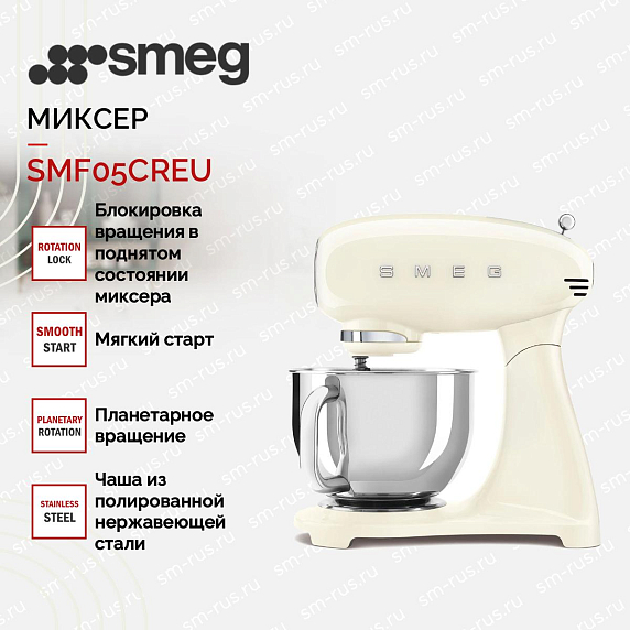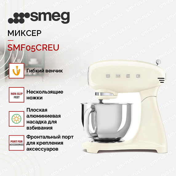Планетарный миксер Smeg SMF05CREU представляет собой идеальное сочетание ретро-дизайна и современных технологий, вдохновлённый стилем 50-х годов. Его кремовый цвет и плавные линии корпуса из литого алюминия придают устройству элегантный и винтажный вид, который украсит любую кухню и станет её настоящей изюминкой. Благодаря компактным размерам при опущенном корпусе (37.8×40.5×22.1 см) и увеличенным (49×40.5×22.1 см) при поднятом, миксер удобно размещается на рабочей поверхности, не занимая лишнего пространства.