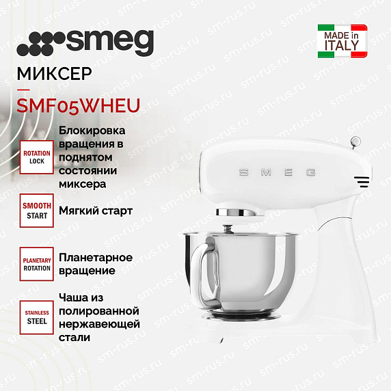 Планетарный миксер Smeg SMF05WHEU — это воплощение элегантности и функциональности, выполненное в стиле 50-х годов, который идеально впишется в интерьер любой кухни. Его изящный белый цвет и гладкие линии корпуса из литого алюминия создают атмосферу ретро-шика, придавая устройству особый шарм и изысканность. Такой дизайн не только привлекает внимание, но и подчеркивает высокое качество исполнения, характерное для техники премиум-класса. Компактные габариты при опущенном корпусе — 37.8×40.5×22.1 см — позволяют удобно разместить прибор даже на небольшой кухонной поверхности, а при поднятом корпусе высота увеличивается до 49 см, обеспечивая комфорт при работе с ингредиентами.