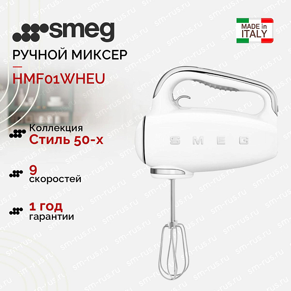 Ручной миксер SMEG HMF01WHEU представлен в белом цвете. С ним вам будет еще приятнее заниматься готовкой блюд.
