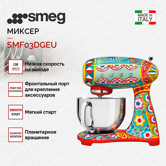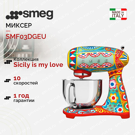 Планетарный миксер Smeg SMF03DGEU — удобная модель из коллекции Sicily is my Love. Прибор отличает уникальный дизайн — изображение цветов и фруктов, яркая цветовая гамма, общая для линейки.