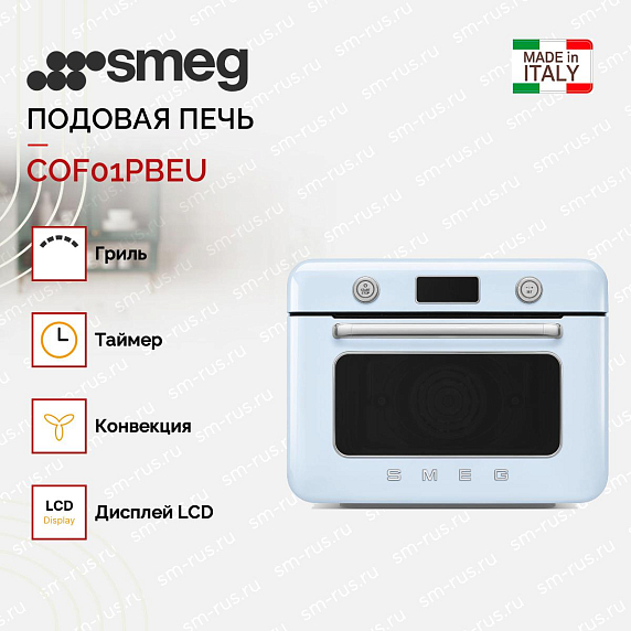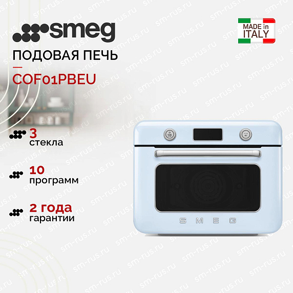 Мини-печь с паром Smeg COF01PBEU — это современное устройство, разработанное итальянским производителем, которое сочетает в себе стильный дизайн и функциональность. В пастельно-голубом цвете эта модель отличается уникальным внешним видом стилистики 50-х годов, который подойдет для кухни в стиле ретро. Компактные размеры (высота 40 см, ширина 50 см и глубина 50 см) позволяют разместить прибор даже в небольшом помещении.