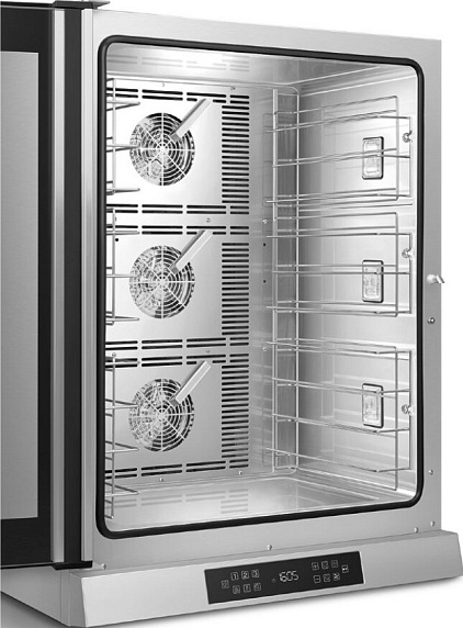 Продуманная конструкция дверной группы и удобный доступ к камере минимизируют время обслуживания, упрощают чистку и замену аксессуаров. Трёхвентиляторная схема в связке с регулировкой оборотов позволяет адаптировать режим под разные рецептуры без необходимости изменения базовых настроек. Огромный набор программ и возможность ручного управления паровой функцией дают операторам свободу экспериментов с текстурами, поджаром и сочностью изделий. Комбинация компактных габаритов, стандартных гастроразмеров и простоты эксплуатации делает аппарат практичным решением для ресторанов, столовых и кейтеринга, где важны надёжность, скорость и предсказуемость результата.