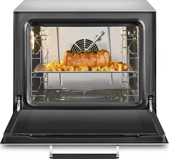 Внутренняя камера из нержавеющей стали рассчитана на четыре уровня размещения с шагом 80 мм, что совместимо с набором из четырёх алюминиевых противней, поставляемых в комплекте. Вентилятор с регулируемой скоростью гарантирует эффективную конвекцию, а комбинированные режимы — чистая конвекция и конвекция с пароувлажнением — расширяют технологические возможности для выпечки, запекания и бережной термической обработки. Регулируемый таймер охватывает диапазон от 1 минуты до 99 часов с опцией бесконечного времени, что удобно при длительной выдержке и контроле партии, а наличие функции предварительного нагрева ускоряет подготовку к работе. Количество программ достигает 99, что позволяет сохранить индивидуальные настройки под разные рецептуры и режимы, повышая повторяемость результатов и экономию времени операторов.