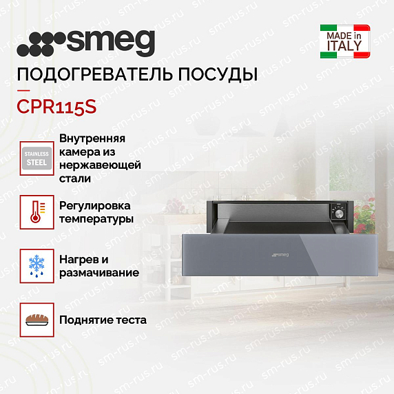 Подогреватель посуды Smeg CPR115S из коллекции Linea представлен в элегантном исполнении из стекла Stopsol серебристого цвета. Модель органично впишется в современный кухонный интерьер с компактным духовым шкафом Smeg SF4120VCS. Подогреватель предназначен для разогрева посуды и пищи, а также поддержки блюд в теплом состоянии. Для надежной устойчивости предусмотрен силиконовый коврик.