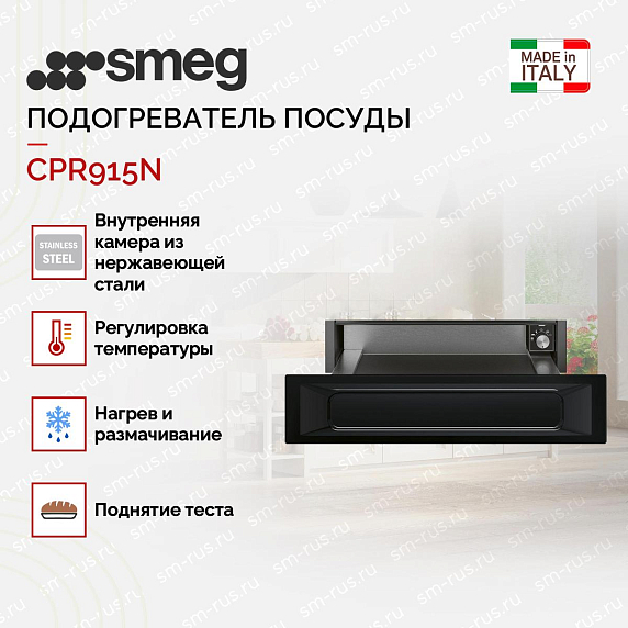 Подогреватель посуды Smeg CPR915N способен не только подогревать, но и, например, размораживать продукты. Управление с помощью поворотного переключателя позволяет выставлять различные температурные режимы от 30 до 80 градусов Цельсия. Устройство оборудовано системой открывания Push, что увеличивает комфорт эксплуатации.