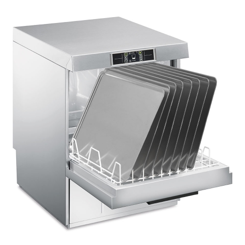 Smeg UD526DS — профессиональная посудомоечная машина с фронтальной загрузкой для кассет размером 500 х 500 и 600 х 500 мм. Наличие водоумягчителя, защищающего нагревательный элемент от образования известкового налета, способствует продлению срока эксплуатации устройства. Технология мягкого старта насоса исключает возможность повреждения хрупких предметов посуды. Для выбора программ и контроля температурных параметров мойки предусмотрена электронная панель управления.