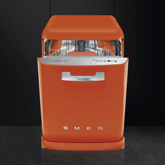 Отдельностоящая посудомоечная машина в оригинальном оранжевом корпусе Smeg LVFABOR характеризуется возможностью одновременной загрузки до 13 стандартных комплектов посуды. Модель оборудована закрытой панелью управления и поддерживает функцию отсрочки включения. Опция Quick Time в сочетании с любым режимом мойки (кроме ополаскивания) служит эффективному сокращению продолжительности цикла.