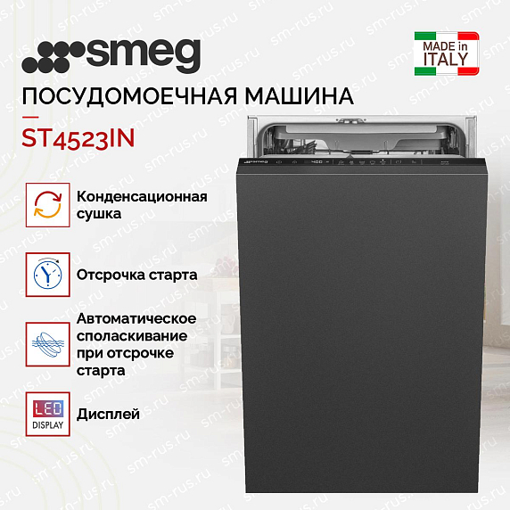 Посудомоечная машина Smeg ST4523IN — компактная встраиваемая модель, которая благодаря инновационным технологиям способна обеспечить высококачественное мытье при низких затратах воды и электроэнергии. Несмотря на ширину всего в 45 см, она способна вмещать в себя до 10 стандартных комплектов, при этом ее корзины регулируются по высоте и имеют фиксированные держатели, что обеспечивает возможность размещения крупногабаритных и нестандартных предметов. А петли дверцы FlexyFit обеспечивают максимально комфортное встраивание, поскольку при открывании они позволяют избежать прикосновения к нижнему цоколю.