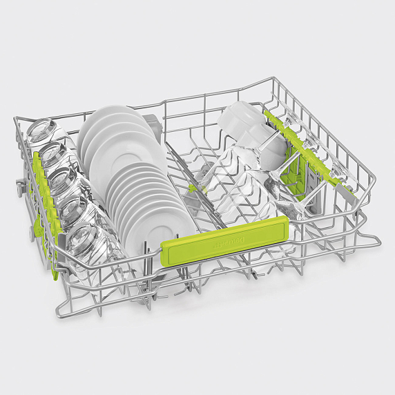 Орбитальная система мойки гарантирует максимально эффективное промывание со всех сторон, независимо от места размещения. Вместимость прибора составляет 13 стандартных комплектов, включающих в себя тарелки, чайную пару и столовые приборы однако внутри предусмотрена возможность размещения и крупногабаритных предметов. Так, верхняя корзина имеет 3 уровня регулировки высоты, а нижняя снабжена складными держателями, которые способны превратиться в плоское пространство, идеальное для кастрюль и больших блюд.