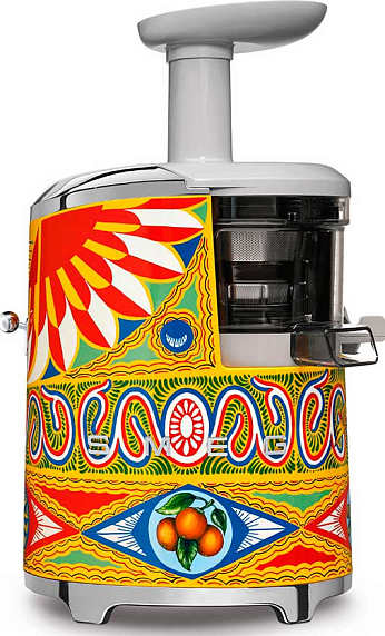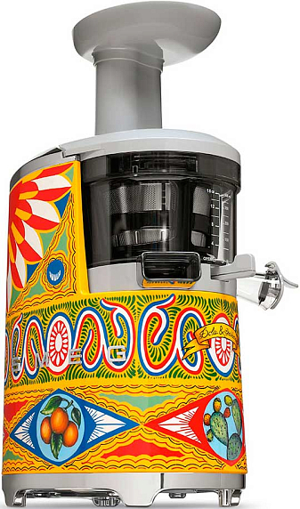 Шнековая соковыжималка Smeg SJF01DGEU из коллекции Sicily is my Love представлена в уникальном дизайне от Dolce&Gabbana. Прибор привлекает внимание яркой расцветкой и необычностью узора. Раздавливание ягод и плодов производится щадящим способом при помощи шнека, который вращается со скоростью всего 43 оборота в минуту. Сок при этом не нагревается, и сохраняются витамины и микроэлементы