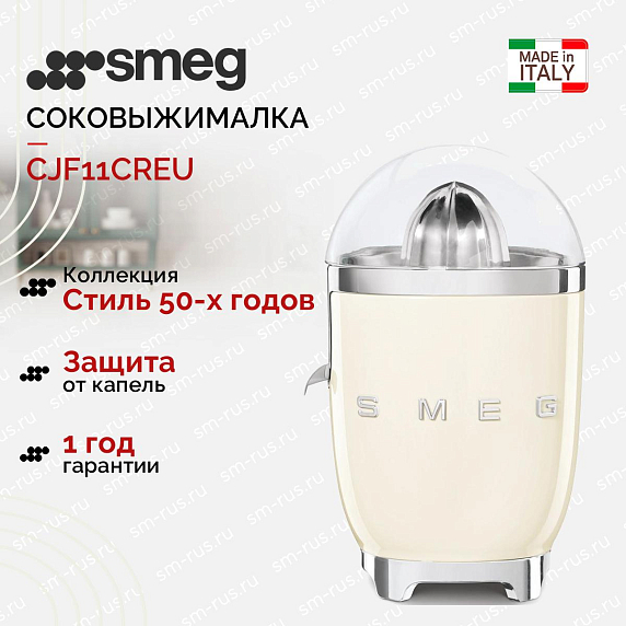 Соковыжималка Smeg CJF11CREU для цитрусовых выполнена в нежном кремовом цвете, а корпус сделан из алюминия. Оснащена ручным отжимом, что дает возможность автономности и тихой работе. Носик-дозатор не дает разбрызгиваться каплям сока.