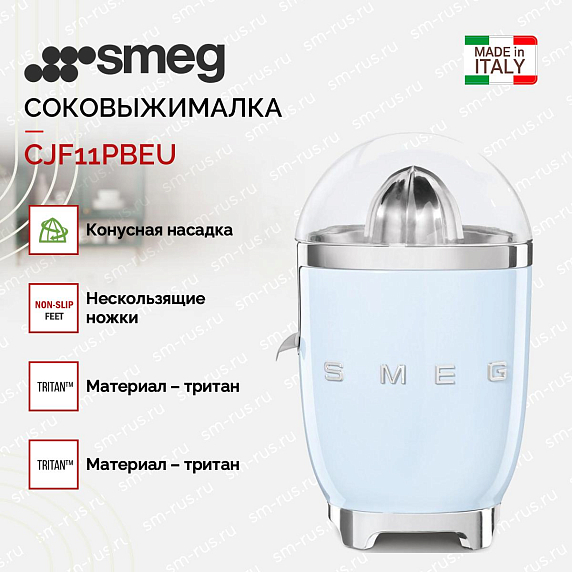 Соковыжималка Smeg CJF11PBEU изготовлена из алюминия в цвете пастельный голубой. Оснащена ручным отжимом, что дает возможность автономности и тихой работе. Также стиль устройства разработан дизайнерами в ретро стиле 50-х годов.