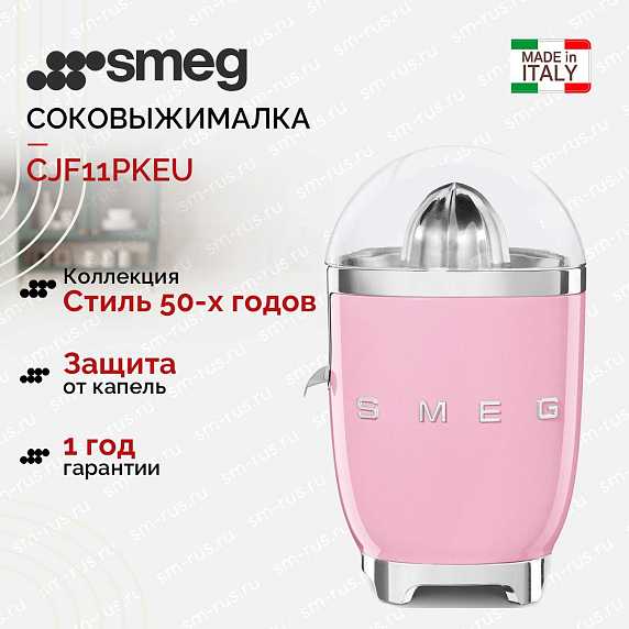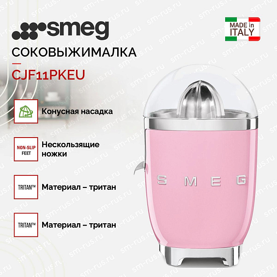 Соковыжималка Smeg CJF11PGEU представлена в розовом цвете, она оснащена ручным отжимом, что дает возможность автономности и тихой работе. Также стиль устройства разработан дизайнерами в ретро стиле 50-х годов.