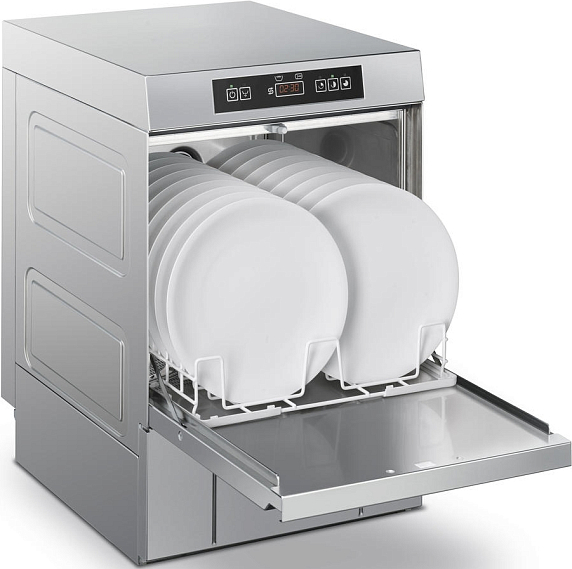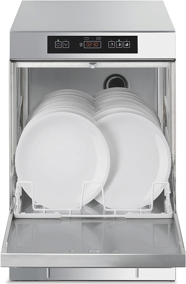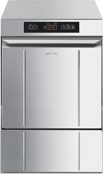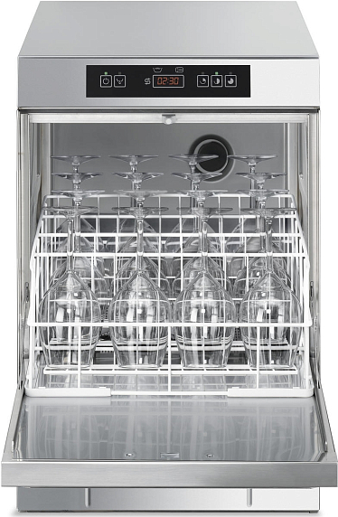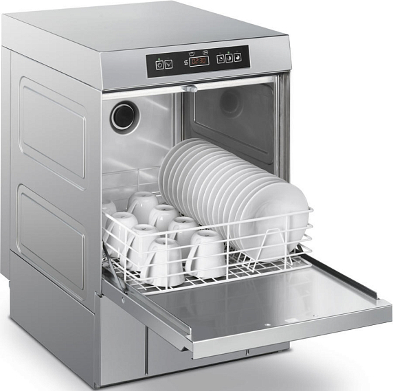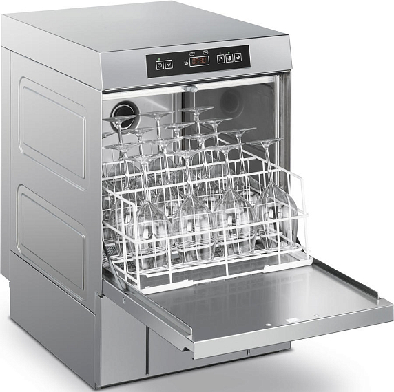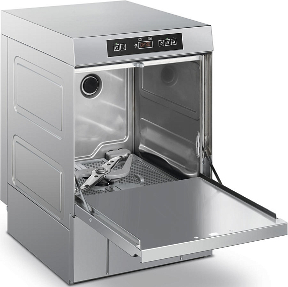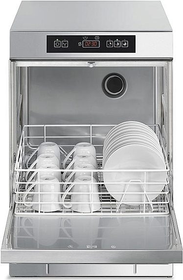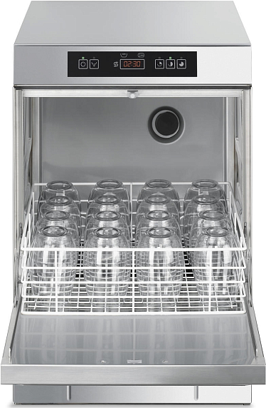 Smeg UG402DMS — профессиональная стаканомоечная машина с электромеханическим управлением. Модель имеет две программы мойки и снабжена встроенным водоумягчителем, защищающим внутренний механизм от образования накипи и известкового налета. Технология автоматической мойки бака упрощает обслуживание устройства.