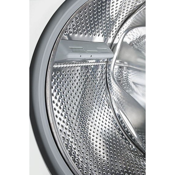 Большой загрузочный люк диаметром 30 см удобен для загрузки и выгрузки белья. Белый корпус из нержавеющей стали прочный, износостойкий.