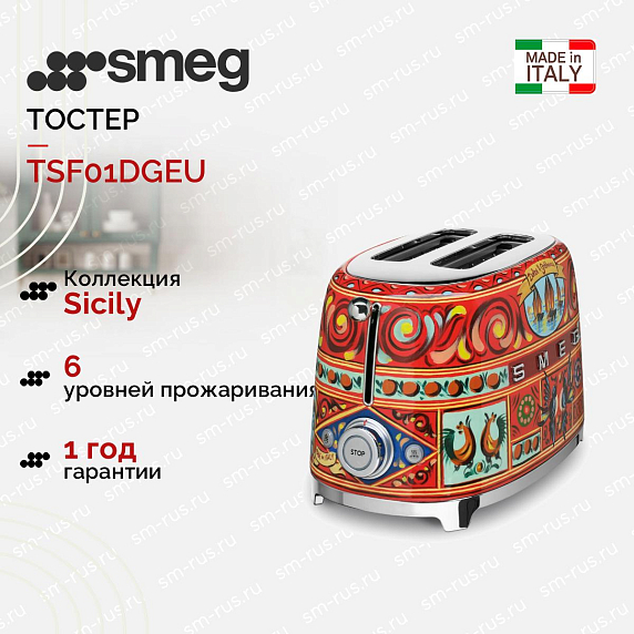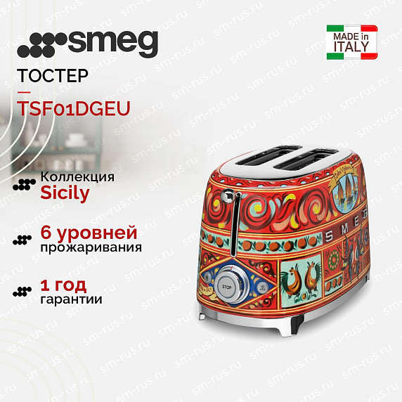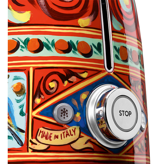 Тостер Smeg TSF01DGEU на 2 ломтика выполнен в уникальном дизайне Sicily Is My Love, который был разработан совместными усилиями Smeg и D&G. Корпус из нержавеющей стали украшен золотыми лимонами и прочими цитрусовыми, а также яркой вишней и различными цветами. Модель имеет 6 уровней поджаривания, а также функции подогрева и размораживания. Конструкция отличается надежной устойчивостью, благодаря нескользящим ножкам.