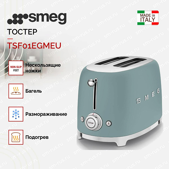 Тостер SMEG TSF01EGMEU идеально подходит для приготовления горячих бутербродов на завтрак. Он имеет два отделения для тостов и позволяет приготовить до двух ломтиков одновременно. Благодаря шести уровням поджаривания, вы сможете выбрать оптимальный уровень нагрева для каждого вида хлеба. Прибор оснащён функцией подогрева и размораживания, что позволяет быстро и легко приготовить горячие бутерброды. Также есть функция багеля, которая позволяет поджаривать только одну сторону булочки или любого другого типа хлеба, оставляя вторую сторону не подрумяненной.