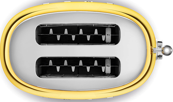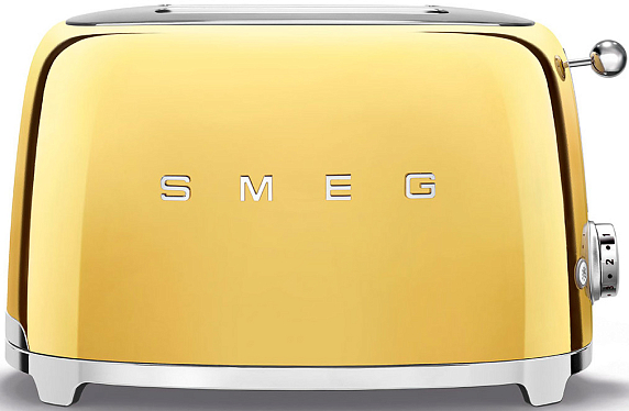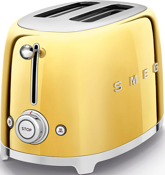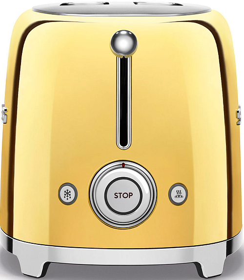 Тостер SMEG TSF01GOEU на 2 ломтика в стиле 50-х годов выпущен в золотом цвете. Прибор позволяет поджаривать хлеб, размораживать тосты и подогревать булочки. Благодаря функции автоматической центровки ломтики находятся на одинаковом расстоянии от нагревательных элементов, и поэтому поджариваются равномерно. Прорезиненные ножки не скользят, что исключает случайное падение и сдвигание.