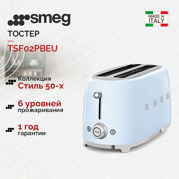 Тостер SMEG TSF02PBEU — это изящная и практичная модель в нежном голубом пастельном цвете. Она выполнена в стилистике 50-х годов и идеально сочетается с остальной техникой этой коллекции
