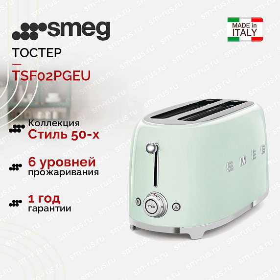 Тостер SMEG TSF02PGEU — изящная и стильная модель в нежном пастельно-зеленом цвете. Два отделения для тостов имеют механизм автоматической центровки, благодаря которому кусочки хлеба размещаются точно посередине