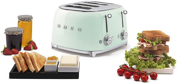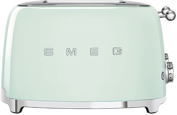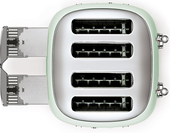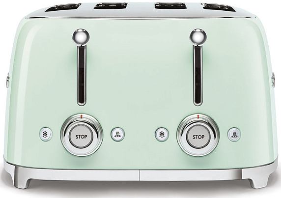 Тостер Smeg TSF03PGEU — модель на четыре ломтика из коллекции Style 50s. Корпус из нержавеющей стали окрашен в пастельный зеленый цвет. Четыре отделения для тостов имеют две панели управления, поэтому можно настраивать интенсивность поджаривания отдельно для разных отделений. съемных поддона легко извлечь для чистки. Нескользящие ножки и отделение для шнура в днище обеспечивают безопасность и удобство хранения.