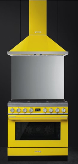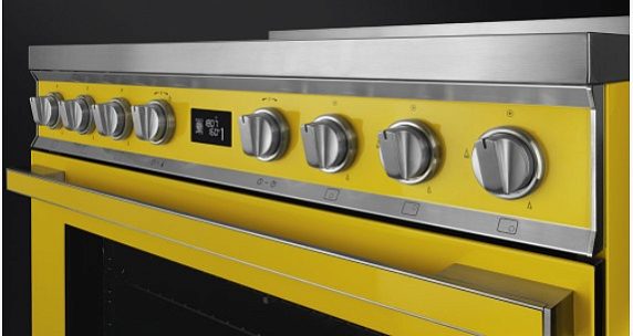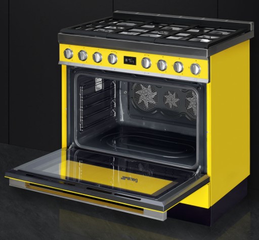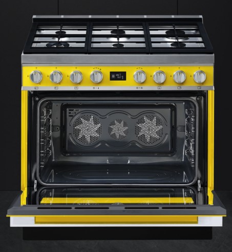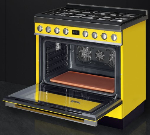 Варочный центр желтого цвета оснащен 6 газовыми конфорками, что позволяет приготовить сразу несколько блюд. Поворотные переключателями из нержавеющей стали, сочетаются по цвету с варочной поверхностью. Для каждого типа продуктов (мясо, рыба, овощи и т.д.) предусмотрена автоматическая программа притотовления. Также можно самостоятельно устанавливать время готовки, по истечению которого прибор отключится автоматически. В нижнем отсеке Push-pull можно хранить принадлежности.Тройная конвекция горячего воздуха помогает пропечь блюдо равномерно.