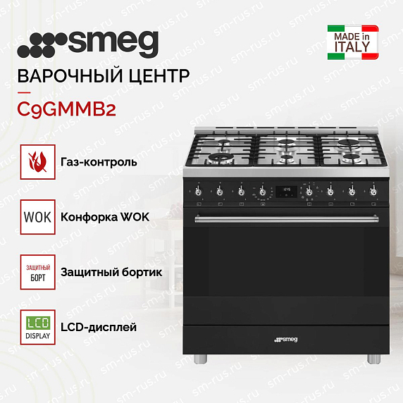 Варочный центр Smeg C9GMMB2 в черном цвете — комбинированная модель с цифровым дисплеем. Газовая варочная панель оснащена 6 конфорками, что позволит готовить оптимальное количество блюд одновременно. Духовой шкаф с 9 режимами оснащен режимом гриля для идеального запекания мяса. Галогенная подсветка обеспечит полный обзор рабочей камеры.