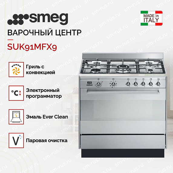Smeg SUK91MFX9 — это варочный центр, который идеально подойдет для любой кухни. Он выполнен в прочном корпусе из нержавеющей стали, который выглядит стильно. Электронно-механическая система управления обеспечивает простоту настройки и выбора режимов приготовления. Вся необходимая информация отображается на дисплее, а переключатели выполнены в стиле ретро и прекрасно дополняют общий дизайн.