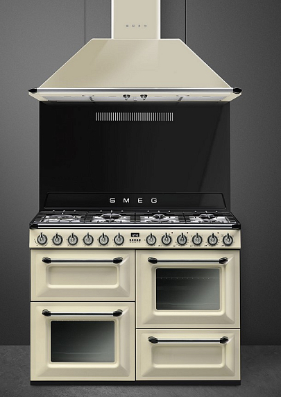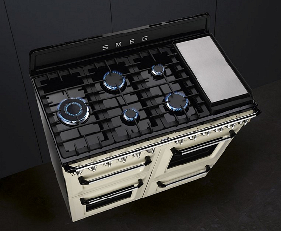 Варочный центр SMEG TR4110P1 серии Victoria — сочетает в себе стильный дизайн и инновационный функционал. Модель выполнена кремовом цвете, благодаря чему, органично интегрируется в любой интерьер. 3 духовых шкафа и газовая варочная панель с семью конфорками позволяют одновременно готовить большой объем пищи. 4 уровня запекания в двух духовках и два в одной помогают создавать сразу несколько блюд без смешения вкусов и запахов. Конфорка повышенной мощности способствует более быстрому процессу закипания, благодаря чему, сохраняются витамины и полезные свойства продуктов.