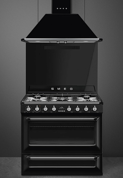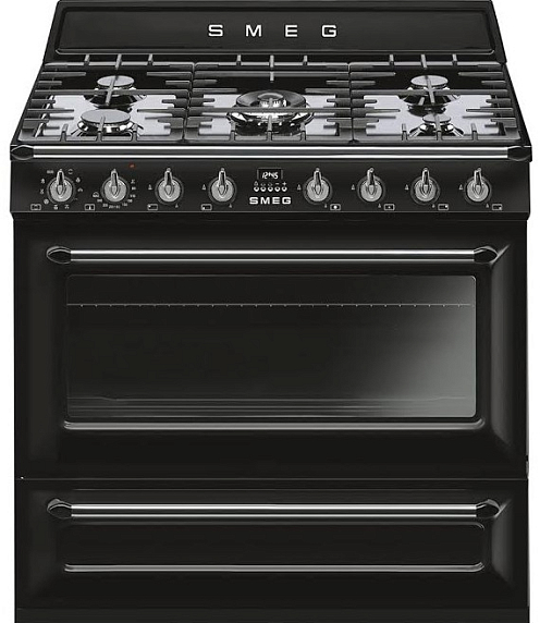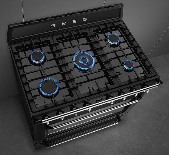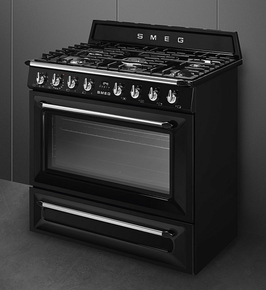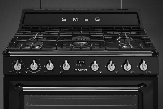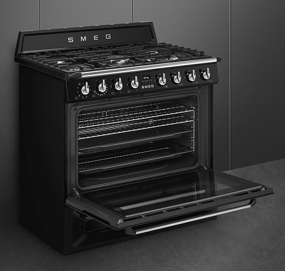 Smeg TR90BL9 — отдельностоящий варочный центр в элегантном черном исполнении. Модель оборудована многофункциональной духовкой с пятью уровнями размещения противней и подсветкой, а также газовой панелью с автоматическим поджигом конфорок. Дверца устройства имеет трехслойное остекление и снабжена практичным доводчиком SoftClose.