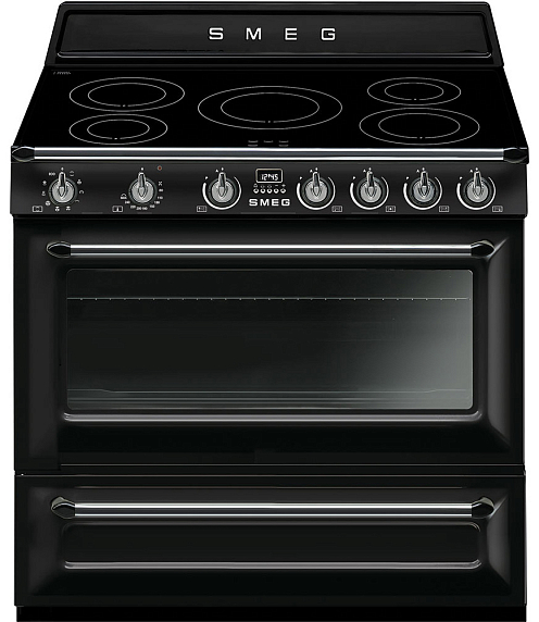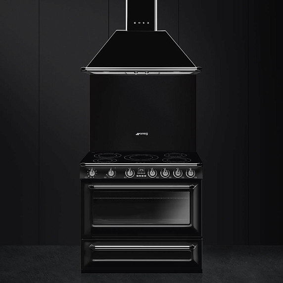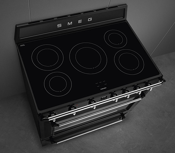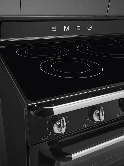 Smeg TR90IBL9 — отдельностоящий кухонный блок в элегантном черном корпусе. Модель оборудована многофункциональной электрической духовкой и индукционной варочной панелью с пятью зонами приготовления. Тангенциальная система охлаждения препятствует перегреву внешних поверхностей корпуса устройства. Для удобства эксплуатации предусмотрена функция отсрочки включения.