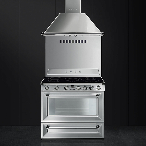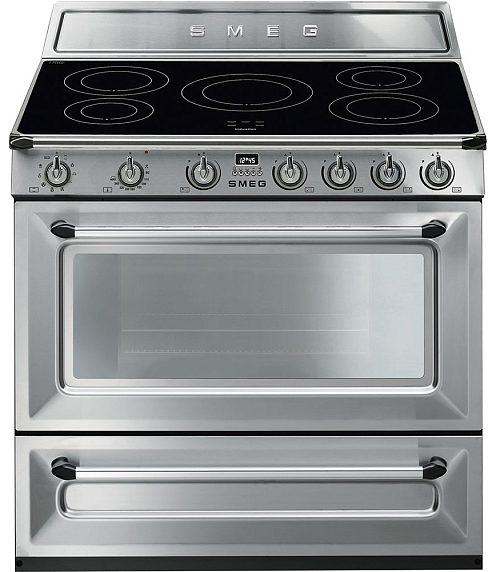 Smeg TR90IX9 — отдельностоящий кухонный блок, оборудованный электрической духовкой и индукционной варочной поверхностью с пятью зонами нагрева. Фронт модели выполнен из нержавеющей стали с обработкой против отпечатков пальцев. Тангенциальная система охлаждения препятствует перегреву корпусных стенок устройства.