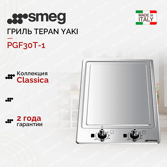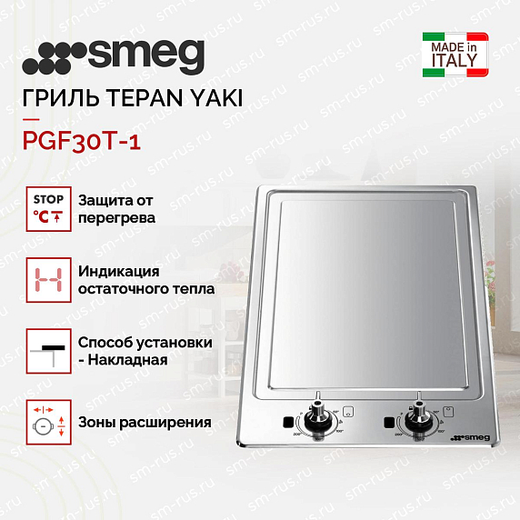 Электрический гриль SMEG PGF30T-1 Tepan Yaki позволяет готовить быстрее за счет функции ускоренного разогрева. От ожогов предохраняет индикация остаточного тепла. Перегрев грилю не страшен — он выключится сам. Две самостоятельные зоны нагрева регулируются пятиступенчатым переключателем.