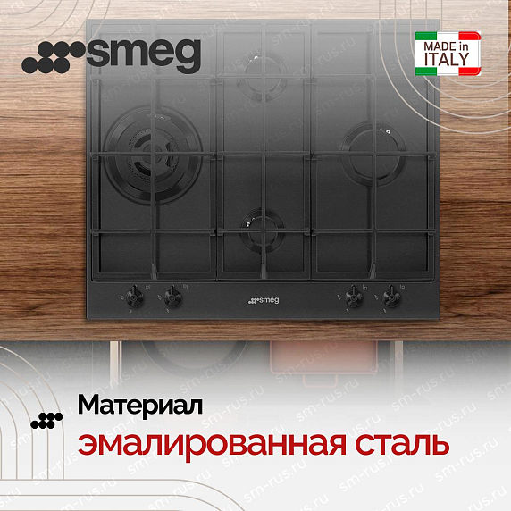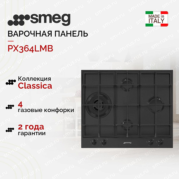 Газовая варочная панель SMEG PX364LMB выполнена в матовом черном цвете с чугунными решетками, которые обеспечат устойчивость посуды. 4 удобные газовые горелки можно зажечь при помощи электроподжига всего лишь одним касанием. А газ-контроль заблокирует подачу газа, если пламя случайно погаснет.