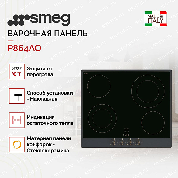 Варочная панель Смег P 864 AO — это идеальное сочетание стиля, функциональности и безопасности. Она станет незаменимым помощником на вашей кухне и привнесет в нее атмосферу итальянского шарма и элегантности.