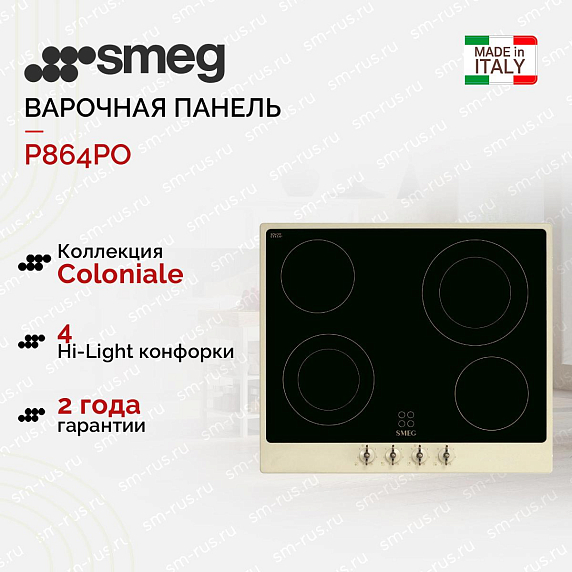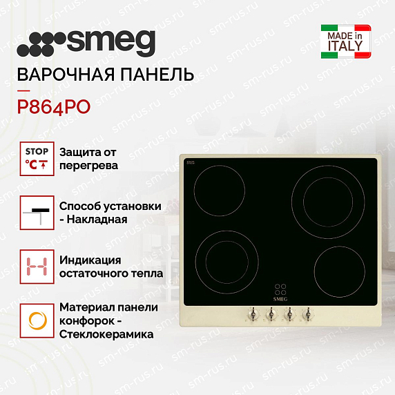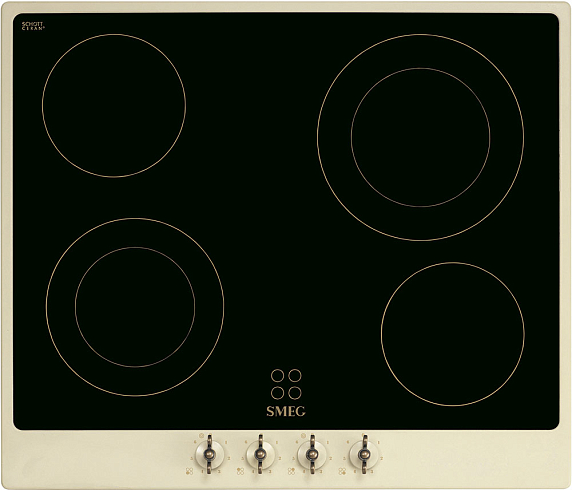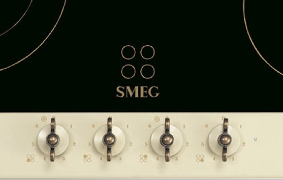 Варочная панель Smeg P864PO представлена в черном цвете с кремовой рамкой и выполнена из стеклокерамики Suprema, которая выдерживает высокие температуры, что обеспечивает долговечность эксплуатации.