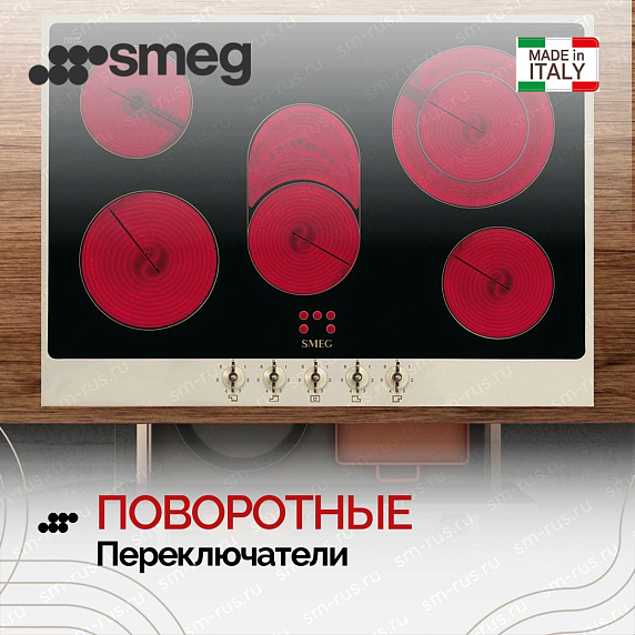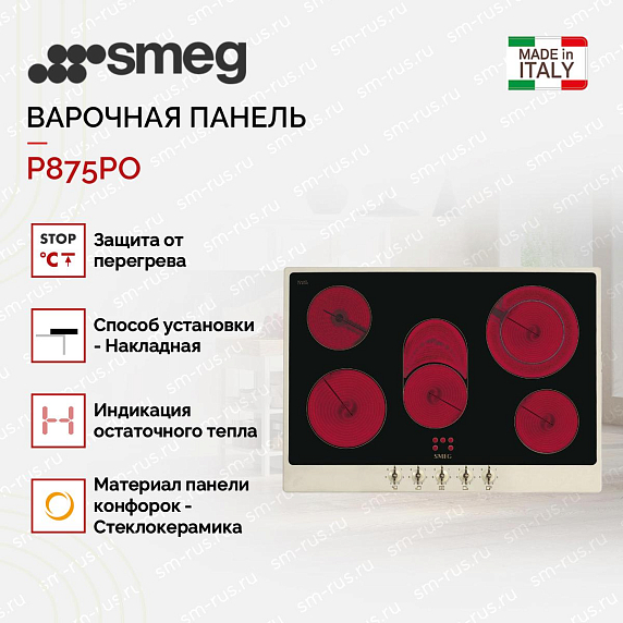 Варочная панель SMEG P875PO итальянского производства оснащена 5 конфорками, сделанными по технологии сверхбыстрого нагрева Hi-Light. Индикация остаточного тепла и защита от перегрева обеспечат комфортное и безопасное использование.