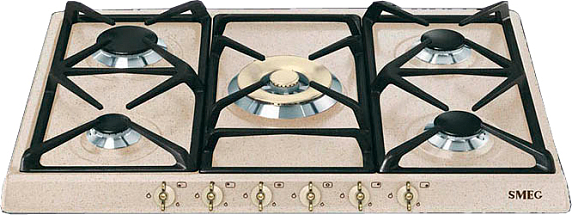 Варочная панель SMEG SPR876AVOGH — стильный дизайн и удобный функционал. Центральная конфорка обладает повышенной мощностью (5 кВт), что позволяет готовить на ней различные деликатесы азиатской кухни или другие блюда на сильном огне.