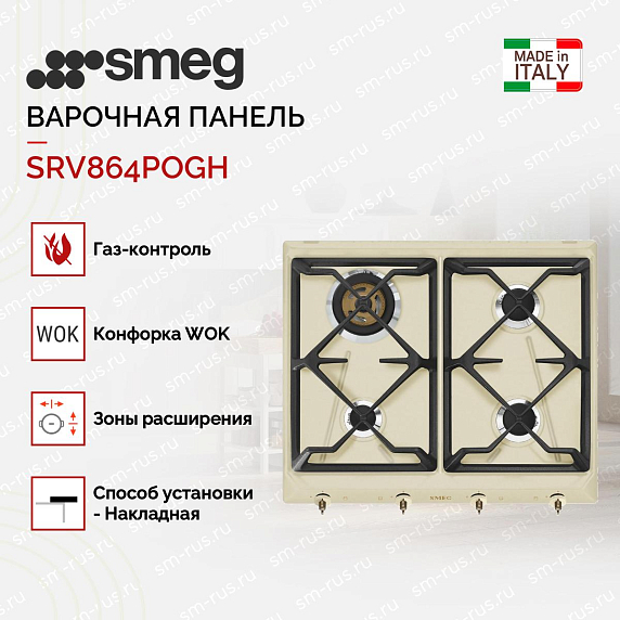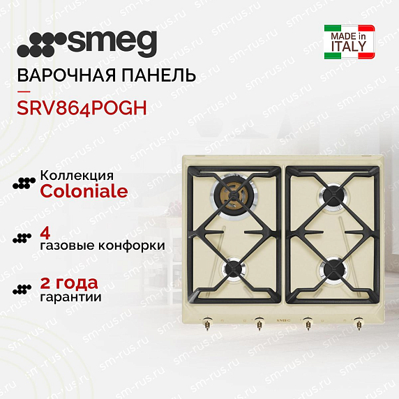 Варочная поверхность SMEG SRV864POGH сочетает в себе классический дизайн, современные технологии, надежность и безопасность. Это компактная варочная панель из коллекции Coloniale выполнена в розовато-кремовом цвете с глянцевой поверхностью за счет эмалированного покрытия, цвет фурнитуры — «латунь». Благодаря изысканному дизайну в интерьере данная модель будет смотреться красиво, отлично дополнит имеющийся набор бытовой техники и кухонной утвари на кухне.