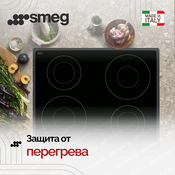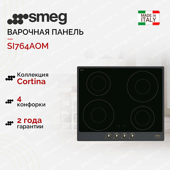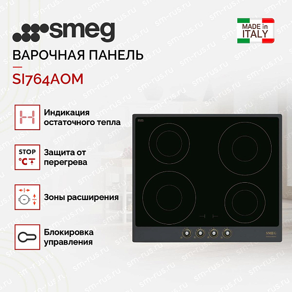 Модель SMEG SI764AOM изготовлена из стеклокерамики в редком антрацитовом цвете. Не нужно подбирать емкость под размеры конфорок, ведь варочная панель имеет функцию автоматического определения размеров посуды. Благодаря функции Booster можно на короткое время в разы увеличивать мощность конфорок.