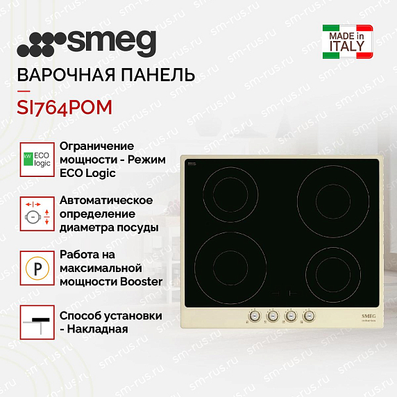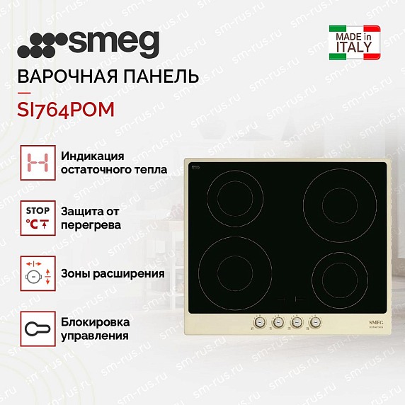 Варочная панель SMEG SI764POM из коллекции Cortina обладает классическим дизайном. Размер посуды определяется автоматически. Конфорки выключаются сами при перегреве. Индикатор тепла гаснет как только температура понижается до 60 градусов. Поворотные переключатели из латуни позволяют точно задавать уровень нагрева.