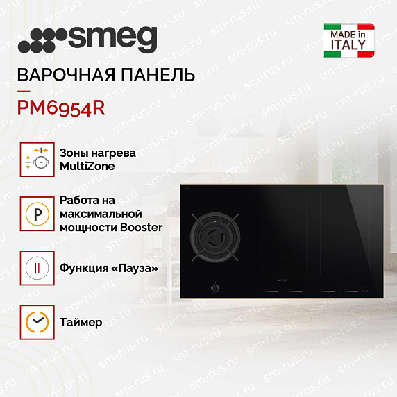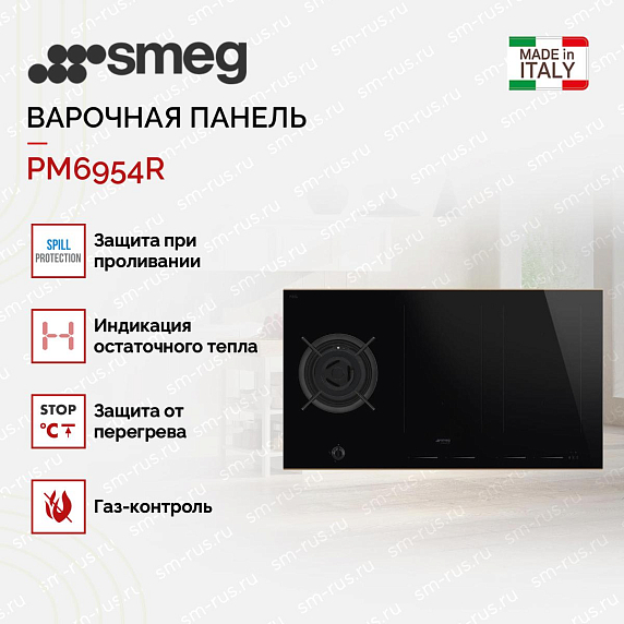 Комбинированная варочная панель SMEG PM6954R позволяет готовить как с помощью газовой конфорки, так и на электрической панели. Газ-контроль перекроет подачу газа, если пламя случайно погаснет. Сенсорные переключатели позволяют наиболее четко регулировать нужный уровень нагрева.