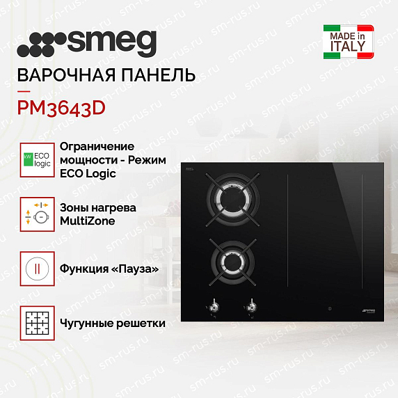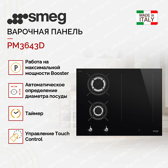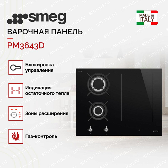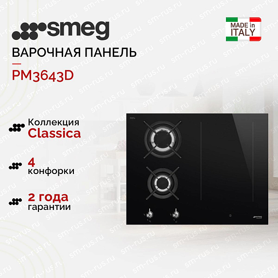 Комбинированная варочная панель SMEG PM3643D так называется из — за соединения в одном устройстве двух газовых горелок и двух индукционных конфорок.