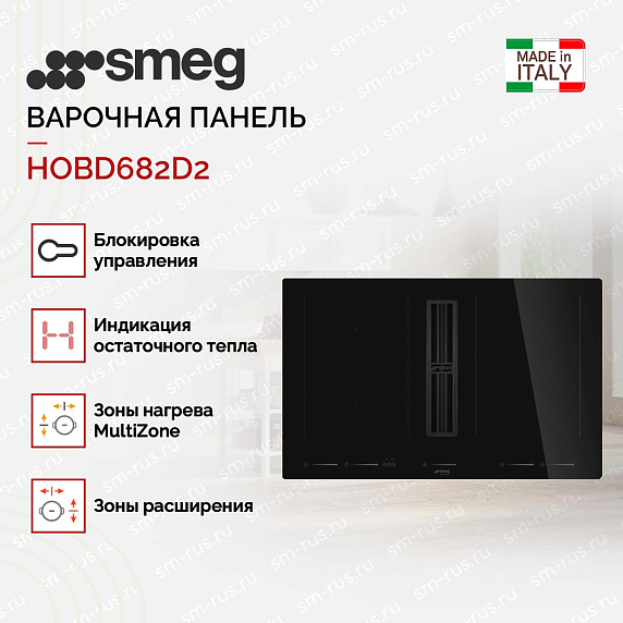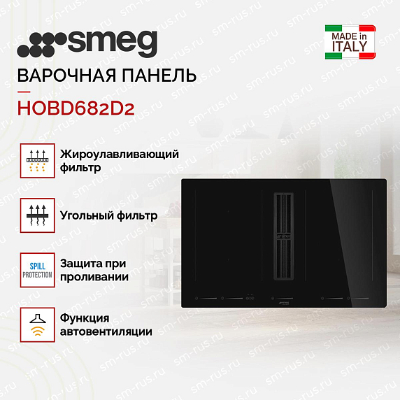Варочная панель с вытяжкой Smeg HOBD682D2 — это уникальное сочетание функциональности и высокого стиля, созданное ведущим итальянским производителем. Элегантная черная стеклокерамическая поверхность с прямым краем вмонтирована в накладную установку, что придает кухне современный и стильный вид.