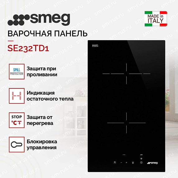 Девять ступеней мощности позволяют выбрать оптимальный режим нагрева для каждого блюда, что обеспечивает равномерное и качественное приготовление. Смег SE232TD1 станет отличным выбором для тех, кто ценит стиль, функциональность и безопасность в бытовой технике. Стеклокерамическое покрытие прочное и не царапается. Устанавливается модель вровень со столешницей — не будет зазоров, в которые мог бы попасть мусор. Сверхбыстрый нагрев Hi-Light экономит время: вода закипает быстрее. Одна из конфорок двухконтурная: можно использовать посуду большого и маленького размера. При проливании жидкости прибор автоматически отключается: масло или бульон не прикипят к стеклокерамике. Защита от перегрева и индикация остаточного тепла тоже есть, поэтому пользоваться варочной панелью безопасно.