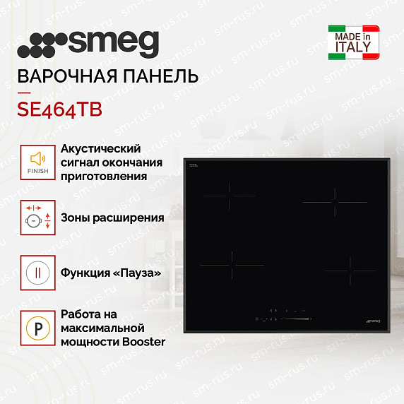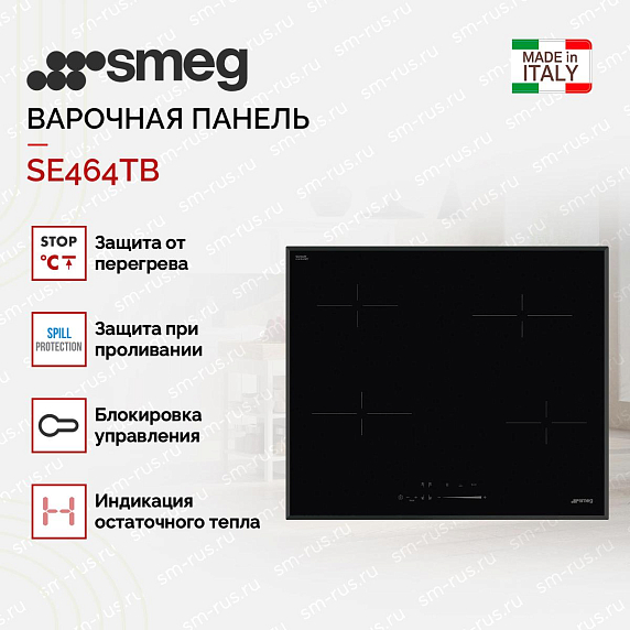 Варочная панель Smeg SE464TB выполнена в элегантном черном цвете, поверхность устройства стеклокерамика. Модель оснащена сенсорным управлением Compact Slider. С индикацией остаточного тепла, вы будете знать, что конфорки еще не достигли минимально допустимой температуры. Функция защита от детей предотвратит активацию настроек.