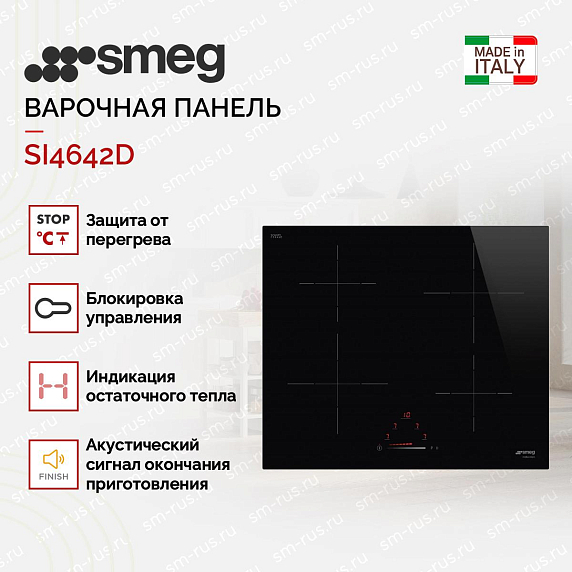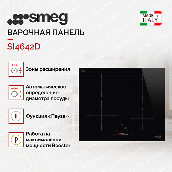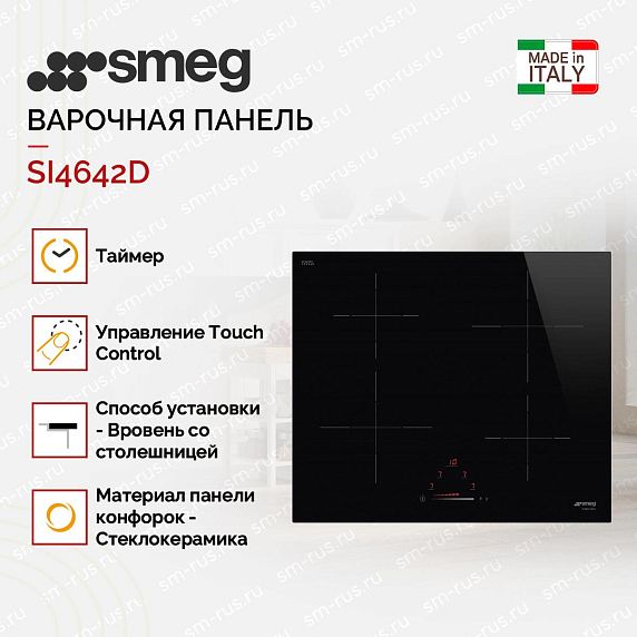 Варочная панель SMEG SI4642D итальянского производства выполнена из черной стеклокерамики. 4 зоны нагрева регулируются сенсорным управлением Touch Сontrol. 9 уровней мощности позволяют оптимально отрегулировать режим приготовления пищи.