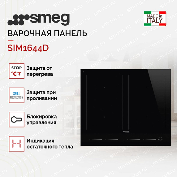 Варочная панель Smeg SIM1644D — современная модель, выполненная в черном цвете. Прибор имеет 4 зоны нагрева, которые можно объединять между собой. Функция блокировки управления обеспечит сохранение установленных настроек, не получится случайно изменить программу, включить или выключить прибор. Индикация остаточного тепла покажет, если зоны нагрева еще не достигли безопасной температуры.